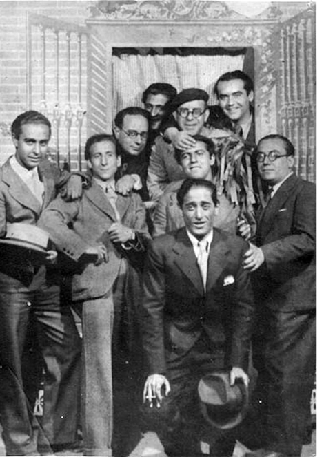 Verbena de San Juan y San Pedro, en la plaza de Atocha de Madrid, 29 de Junio de 1936. A la izquierda, José Caballero, Morales, Adolfo Salazar, López Valencia, Eduardo Ugarte (codirector de La Barraca), Federico García Lorca, Rafael Rapún, el torero Pepe Amorós y Morán. Foto: josecaballero.info